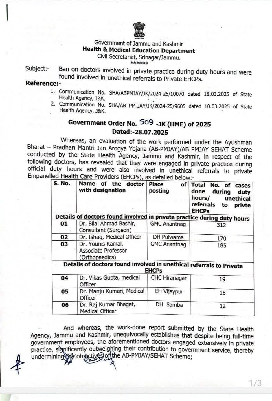 SRINAGAR, July 28, 2025 : The Jammu and Kashmir Government has barred six doctors from practice following allegations of engaging in private consultations during official hours and making unethical referrals to private Empanelled Health Care Providers (EHCPs).