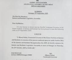 📍 Srinagar, September 27, 2025 : Lieutenant Governor Manoj Sinha has convened the session of the Jammu and Kashmir Legislative Assembly in Srinagar next month.